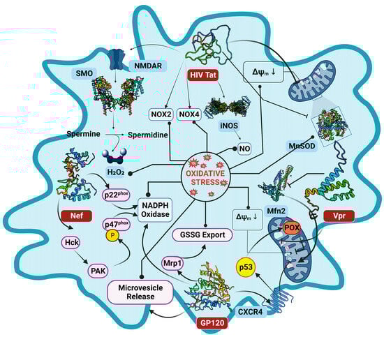 The HIV-1 Negative Regulatory Factor (Nef) is a nonenzymatic accessory protein known to be vital in maintaining the persistence of HIV infection by enhancing viral replication and promoting immune evasion. The Nef protein exhibits significant upregulation during the early stage of infection but maintains its expression throughout all subsequent stages, interfering with diverse host signaling pathways [61,62]. Olivetta et al. investigated the effects of Nef on the NADPH oxidase complex in human macrophages and reported that the Nef regulated the (•O2−) release by modulating NADPH oxidase activity through the phosphorylation of the p47(phox) subunit of the NADPH oxidase complex by Nef-activated Src kinases and PI3K [63]. Nef was also found to associate with p22-phox, another subunit of NADPH oxidase complex, increasing the superoxide production [64]. Nef could also activate the NADPH oxidase indirectly, by triggering the Vav/Rac/p21-activated kinase (PAK) signaling pathway involved in the instigation of phagocyte NADPH oxidase [65]. Masanetz et al. investigated the sensitivity of astrocytes towards hydrogen peroxide and concluded that the Nef protein contributes to a decrease in the tolerance of astrocytes, leading to neuronal dysfunction and HIV-associated dementia (HAD) [66], while it is well reported that HAD patients show an elevated expression of Nef protein in the astrocytes [67].