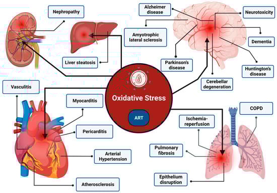 The OS induced by the interplay of HIV infection and antiretroviral therapy (ART) can exert a significant impact on the onset and progression of diverse pathologies (Figure 5). This can have broad-ranging ramifications, exerting effects on multiple organ systems. The most major of all, HIV can enter the Central Nervous System (CNS) and cause a persistent infection, leading to a spectrum of neurocognitive dysfunction referred to as HAND (HIV-associated neurocognitive disorder) [107]. Y. Wang reported, in one of their meta-analysis, a high prevalence (42.6%) of HIV-associated neurocognitive disorders (HAND) in the HIV-infected population, suggesting an excessive burden of neuro-pathologies [108]. Evidence advocates that the chronic inflammation leading to the neurodegeneration observed in HIV infection is predominantly associated with ROS hyperproduction. A study by J. Louboutin et al. substantially demonstrated the mediation of OS in generating neuroinflammation when Rat caudate-putamens were administrated with HIV Tat [109]. The intervention of OS is also reported in facilitating neuronal apoptosis. The investigation by B. Shi et al. examined if the exposure of human neurons to HIV-1 Tat and TNF-alpha can instigate neuronal apoptosis, and they clearly identified that, through increasing the OS, both Tat and TNF-alpha can cause neurotoxicity thus leading to neuronal apoptosis in the brain of AIDS patients [110]. The clear relationship of OS in HAND is exemplified where reduced volumes of the hippocampus and subcortical gray matter correlated with increased oxidative mitochondrial DNA damage in peripheral blood mononuclear cells in chronically HIV-infected patients [111]. In addition to other contributing factors, lipid peroxidation also plays a role in the development of neurological disorders by contributing to neurotoxicity and subsequent pathology.
