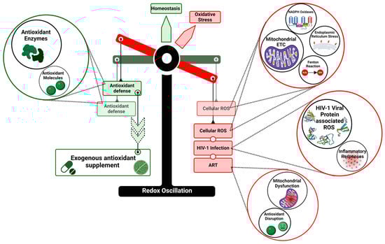 The cellular redox balance is a consequence of dynamic counteracting interactions, and any disturbance in it would lead to the deficit of antioxidant defense, prompting OS (Figure 6). The relationship between HIV infection, ART, and OS presents a complex hurdle in the management of HIV/AIDS. The dual role of ROS in HIV infection presents a significant challenge. On the one hand, ROS can trigger host antiviral responses, potentially beneficial in controlling viral replication. On the other hand, excessive ROS production clearly contributes to cellular damage and various HIV-associated pathologies. This duality highlights the need for a more refined approach to managing OS in HIV patients.