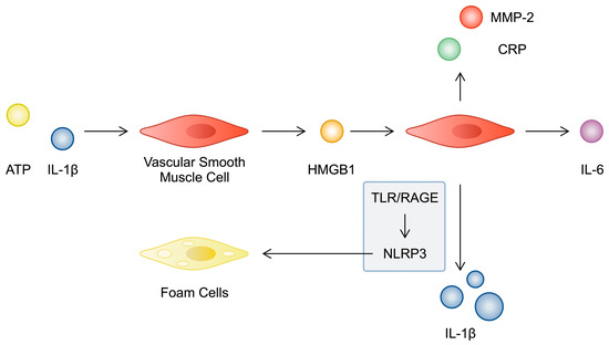 Studies have demonstrated that HMGB1 affects the behaviour of various cells associated with atherosclerosis, including VSMCs, endothelial cells, macrophages, and T cells. Firstly, alarmin is expressed in atherosclerotic plaques. In an early study performed by Inoue et al., HMGB1 immunoexpression was detected in the intima of plaques from carotid endarterectomy samples. Furthermore, the authors detected alarmin in both macrophages and VSMCs; these same cell populations were found to be positive for HMGB1 in samples of coronary atherosclerosis. Interestingly, the authors also performed an in vitro experiment investigating the influences of alarmin on pro-inflammatory responses by VSMCs. Stimulation of VSMCs with HMGB1 increased the expression of mRNAs for C-reactive protein (CRP) and matrix metalloproteinase 2 (MMP-2) [18]. These results suggested that HMGB1 participates in inflammatory responses and affects plaque vulnerability, as MMP-2 is thought to participate in the progression of atherosclerosis in multiple ways [19]. The relationship between HMGB1 and inflammation is also complex and involves several mechanisms. Pretreatment of VSMCs with IL-1β has been shown to enhance the expression of both HMGB1 and its receptor, RAGE; this upregulation involves the P2Y2R receptor and the ROCK2, Rac-1, AKT, ERK, and PKC pathways [20]. In turn, HMGB1 enhanced the production of IL-1β in VSMCs, which is dependent on the TLR2, TLR4, and RAGE receptors. Furthermore, alarmin stimulated pro-inflammatory responses through the inflammasome of NLR family pyrin domain-containing proteins 3 (NLRP3) [21]. NLRP3 is a major pro-inflammatory structure that enhances pyroptosis, which is a mechanism of cellular death (a detailed description can be found in [22]). Importantly, several studies have demonstrated that NLRP3 is a potential treatment target in atherosclerosis, as it is involved in pathways that enhance the progression of the disease but are suppressed by NLRP3 inhibitors [23,24]. Studies suggest that NLRP3 and HMGB1 could be correlated in a signalling loop that eventually enhances the formation of atherosclerotic plaques. Specifically, NLRP3 was found to stimulate the translocation of HMGB1 from the nucleus to the cytoplasm, which was followed by its extracellular release by VSMCs. HMGB1 subsequently contributed to cholesterol accumulation in VSMCs in addition to suppressing the expression of LXRα and ABCA1 [25]. Moreover, treatment of VSMCs with HMGB1 was demonstrated to enhance IL-6 production, which was dependent on the p38 and ERK1/2 signalling pathways [16].
