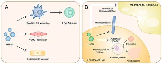 Summary of potential mechanisms induced by HSPs associated with atherosclerosis. (A) HSP60 influencing endothelial cells, vascular smooth muscle cells, and dendritic cells to induce atherogenic responses. (B) HSP70 negatively regulating thrombomodulin and taking part in the process of autophagy in endothelial cells, as well as suppressing cholesterol efflux from macrophages.