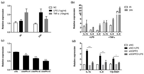 Therefore, to investigate whether this phenomenon also occurs in keratinocytes, we examined the transcriptional level of SGPP2 in keratinocytes treated with LPS and TNF-α at 4 and 24 h post-treatment (Figure 1a). Similar to the observations in endothelial cells [27], we found that SGPP2 upregulation was more rapid upon TNF-α treatment. The transcriptional level of SGPP2 was 2.25-fold higher 4 h after TNF-α treatment, while a similar transcriptional level was observed 24 h after LPS treatment. We also examined the transcriptional levels of IL-1β, IL-6, and IL-8, which are the cytokines that share downstream signaling pathways at the same time points. This analysis revealed a pattern of increased expression of inflammatory cytokines along with SGPP2 upregulation (Figure 1b). The differences in the response patterns of SGPP2 upregulation and inflammatory cytokine expression to LPS and TNF-α, respectively, are believed to be owing to differences in the response rates of NF-κB signaling induced by their respective receptors [31]. Based on the findings presented in Figure 1a,b, we confirmed that SGPP2 upregulation and the expression of other inflammatory cytokines occur in skin keratinocytes upon LPS or TNF-α treatment.