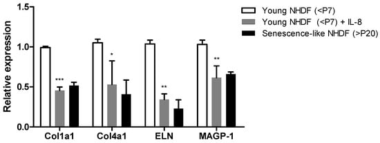 Expression of genes associated with human skin ECM under inflammatory conditions compared to senescence-like normal human dermal fibroblasts (NHDFs). Relative expression of Col1a1, Col4a1, ELN, and MAGP-1 in young NHDFs with or without IL-8 (10 ng/mL) for 24 h and in senescence-like NHDFs, which were cultured for more than 20 passages. Bars indicate standard deviation (n = 3). Data were compared between young NHDFs treated with or without IL-8. *** p < 0.001, ** p < 0.01, * p < 0.05; Student’s t-test.