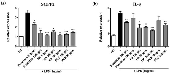 Screening materials with the ability to downregulate SGPP2 expression and IL-8 inflammatory cytokine. (a) Relative expression of SGPP2 in keratinocytes (HaCaT) treated with Fucoidan, Feruloyl Serotonin (FS), Hyaluronic acid (HA), and Polygonum cuspidatum root extract (PCE) at the mentioned concentrations. All samples except Negative control (NC) are treated with LPS (1 ug/mL). (b) Anti-inflammatory effect of SGPP2-downregulating materials that decreases IL-8 expression in LPS-treated keratinocytes. Bars indicate standard deviation (n = 3). *** p < 0.001, ** p < 0.01, * p < 0.05; Student’s t-test.