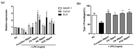CM from LPS-treated keratinocytes significantly downregulated MAGP-1, Col1a1, and ELN expression in fibroblasts by 23%, 37%, and 75%, respectively, compared with the control CM (Figure 4a). Fucoidan-containing CM markedly reversed the LPS-induced decrease in MAGP-1 expression. Additionally, CM containing feruloyl serotonin, hyaluronic acid, or PCE substantially significantly increased the expression of MAGP-1, Col1a1, and ELN, which were downregulated by LPS treatment.
