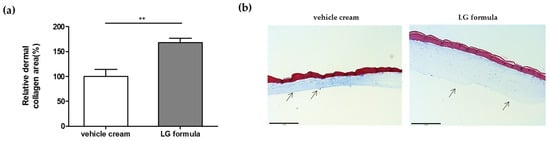 We applied creams containing our four active materials (LG formula) to the 3D skin model and compared the results to those obtained with a vehicle cream. Through a comprehensive evaluation of in vitro efficacy concentrations, stability, and solubility, an optimal combination of the four active materials was determined and formulated. After treatment for 48 h, the relative area of dermal collagen significantly increased by +68.1% in the LG formula-treated samples (Figure 5a). This enhancement in the dermal collagen area was further confirmed through histological analysis (Figure 5b).