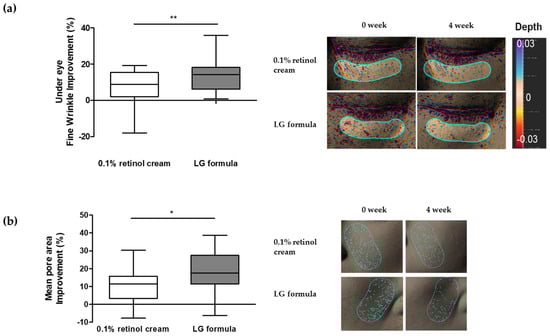 Subsequently, we conducted an experiment to determine if the formulation containing four types of active materials improved the appearance of facial wrinkles and pores. Based on the 3D human skin model test, we formulated LG formulas containing each of the four active materials and tested them to determine if they improved the appearance of wrinkles on the under eye and pores. To accurately measure the efficacy of the LG formula, a half-test method experiment was conducted, where 0.1% retinol cream of the same base formula was applied to the left side of the face, and the LG formula cream containing four active substances was applied to the right side of the face. To assess the efficacy of four active material complexes, we selected 0.1% retinol cream as a control, given its established reputation as a highly effective anti-wrinkle ingredient. The changes in the area of facial wrinkles and pores were measured with Antera 3D, among which the Ra value of texture, which is a common parameter for measuring fine wrinkles [50], and the average pore area, which is a suitable parameter for showing stretched pores or pore elongation, were measured [15,51].