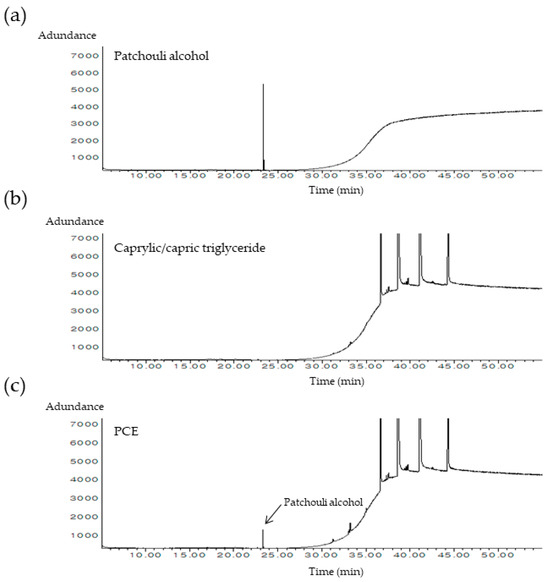 GC-MS chromatograms of PCE. (a) Patchouli alcohol standard. (b) Extraction solvent; caprylic/capric triglyceride. (c) PCE.
