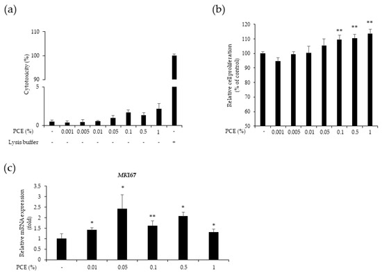 Effect of PCE on the cytotoxicity and proliferation of HaCaT cells. The cells were treated with PCE at different concentrations (0.001, 0.005, 0.01, 0.1, 0.5 and 1%) for 24 h. Cell cytotoxicity (a) and cell proliferation (b) assessed using the LDH (lactate dehydrogenase) assay and the cell counting kit (CCK)-8 assay, respectively. (c) The expression level of cell proliferation marker MKI67 gene increased by PCE treatment. Quantitative polymerase chain reaction (qPCR) was used to measure the relative expression levels of the MKI67 gene. Data represent the mean ± SEM. * p < 0.05, and ** p < 0.01 compared to the control group.