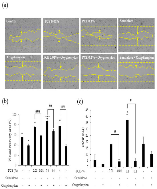 PCE induced wound healing through the activation of OR2AT4 in vitro. (a) An artificial wound was created using a Culture-Insert 2 Well 24 plate (ibidi) for the wound healing assay. All wound areas were initially equal in size before treatment, and the wound area was measured after 18 h of treatment with PCE (0.01 and 0.1%), 500 µM Sandalore, and 500 µM Oxyphenylon. (b) Graphical representation of the area of wound healing in the image (a). (c) Graph showing PCE-induced dose-dependent increase in cAMP levels in HaCaT cells treated with PCE, 500 µM Sandalore, and 500 µM Oxyphenylon for 20 min. Data represent the mean ± SEM. * p < 0.05 and *** p < 0.001 compared to the control; # p < 0.05, ## p < 0.01, and ### p < 0.001 compared to the Oxyphenylon-treated group.