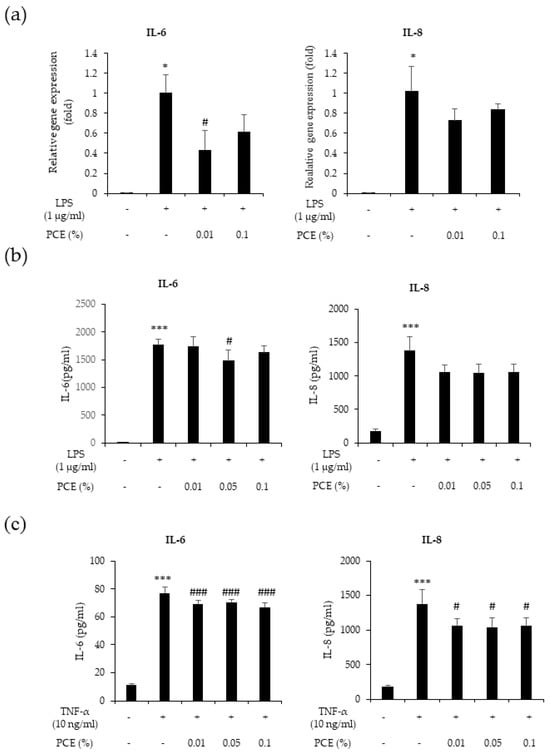 Anti-inflammatory activities of PCE in THP-1 and HaCaT cell. THP-1 and HaCaT cells were pretreated with various concentrations of PCE (0.01, 0.05, and 0.1%) and then stimulated with LPS and TNF-α for 24 h. (a) mRNA expression levels of inflammatory genes IL-6 and IL-8 measured using qPCR. (b,c) Protein levels of pro-inflammatory cytokines IL-6 and IL-8 in THP-1 (b) and HaCaT (c) cells measured using ELISA. The protein levels of each protein were normalized to the total protein amount. Data represent the mean ± SEM of three independent experiments. Statistical significance is indicated as * p < 0.05 and *** p < 0.001 compared to the control group; # p < 0.05 and ### p < 0.001 compared to the LPS and TNF-α treated group.