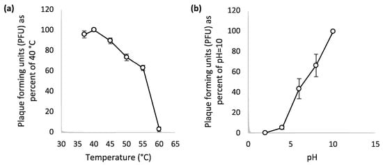 Temperature and pH are two important factors for the survival of a bacteriophage. For this reason, the stability of Escherichia phage Ioannina at different pH values (2, 4, 6, 8, 10) and temperatures (37, 40, 45, 50, 55, 60 °C) was determined (Figure 4a). Heat treatment for 1 h at 45–55 °C presented a gradual reduction of about 40% in phage viability as measured by its plaque-forming ability. Heat treatment at all temperatures greater than 40 °C diminished phage viability. Phage viability is eliminated at 60 °C. Τhe phage also showed highly lytic activity in alkaline pH. More specifically, the phage viability showed a constant reduction towards the acidic end of the pH spectrum (Figure 4b).