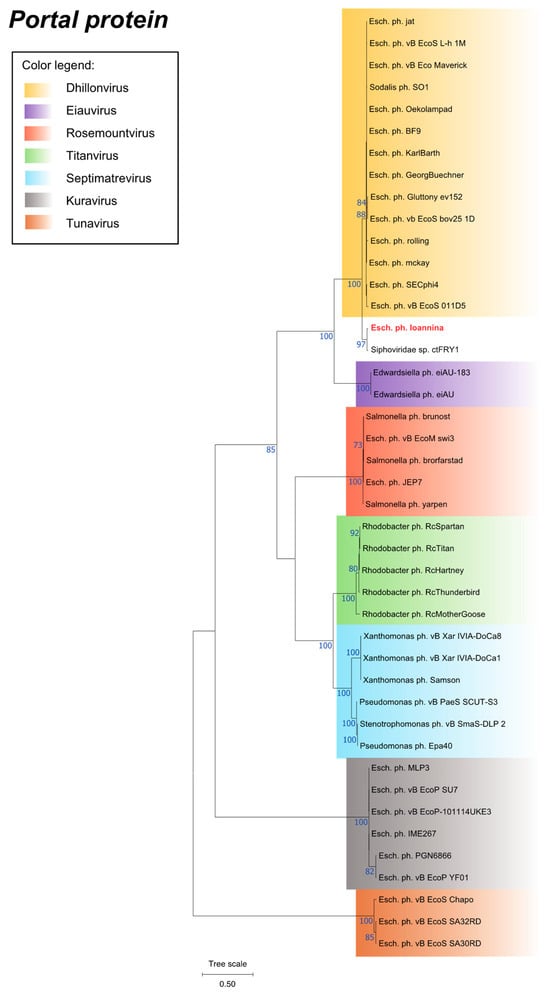 Phylogenetic tree of the Escherichia phage Ioannina portal protein constructed using the Maximum Likelihood method of the MEGA11 software. The “Esch. Ph. Ioannina” represents the Escherichia phage Ioannina portal protein. Bootstrap values (blue-colored text) were obtained from 100 bootstrap replicates, and only those above 70 are displayed next to each node. The tree scale is displayed on the bottom left corner of the phylogenetic tree.