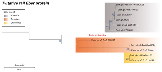 Phylogenetic tree of the Escherichia phage Ioannina putative tail fiber protein constructed using the Maximum Likelihood method of the MEGA11 software. The “Esch. ph. Ioannina” represents the Escherichia phage Ioannina putative tail fiber protein. Bootstrap values (blue-colored text) were obtained from 100 bootstrap replicates, and only those above 70 are displayed next to each node. The tree scale is displayed on the bottom left corner of the phylogenetic tree.