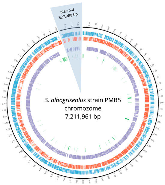 Map of the S. albogriseolus strain PMB5 genome visualized using the Proksee tool—bacterial chromosome (linear) and plasmid (linear). Forward genes are depicted in blue, reverse genes in red, core-genes in purple and strain-specific genes in green.