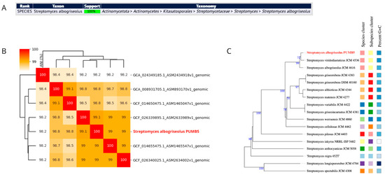 Specific Confirmation of the PMB5 genome: (A) PubMLST results; (B) whole-genome phylogenetic tree generated by TYGS database; and (C) ANI heatmap calculated between the PMB5 genome and publicly available genomes at NCBI.