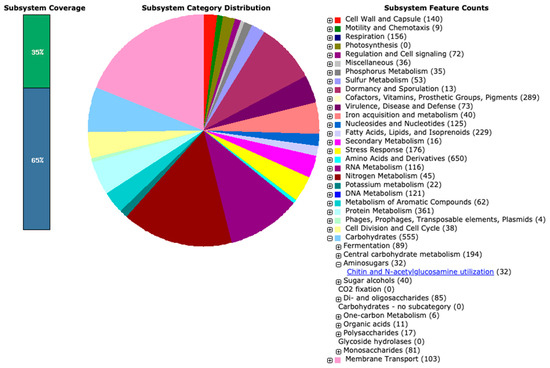 To explore the genomic landscape of the newly assembled genome of the PMB5 strain, we employed the RAST server and complemented the annotation with BlastKOALA results. A total of 6683 genes were identified, comprising 6592 protein-coding sequences (CDS) and 91 RNA genes (70 tRNAs, 18 rRNAs, and 3 ncRNA). Among the predicted CDS, 4793 genes (72.71%) were functionally annotated, while 1799 genes (27.29%) remained hypothetical/unknown. RAST analysis revealed the involvement of proteins in 439 subsystems (Figure 4). Supplementary Data Table S1 contains a detailed breakdown of the RAST and BlastKOALA annotations. Notably, these genes were predominantly associated with various protein families, including amino acids and derivatives (650), carbohydrates (555), protein metabolism (361), cofactors, vitamins, prosthetic groups, pigments (289), fatty acids, lipids, and Isoprenoids (229), among others. The genus Streptomyces is known for its ability to produce a wide variety of secondary metabolites, including antibiotics, which enables them to adapt to diverse environmental conditions [46]. In this context, numerous genes related to stress response (176), the metabolism of aromatic compounds (62), sulfur metabolism (53), nitrogen metabolism (45), phosphorus metabolism (35), potassium metabolism (22), secondary metabolism (16), resistance to antibiotics and toxic compounds (51), and more, were identified. Regarding chitin and N-acetylglucosamine utilization, the RAST tool identified 32 genes.