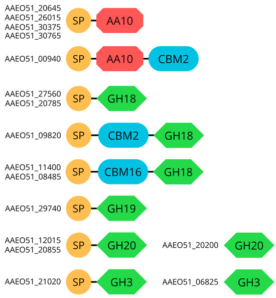 Structural domain organization of predicted CAZymes involved in the direct hydrolysis of chitin. SP: signal peptide; GH: glycoside hydrolase; CBM: carbohydrate-binding module; AA: auxiliary activities.