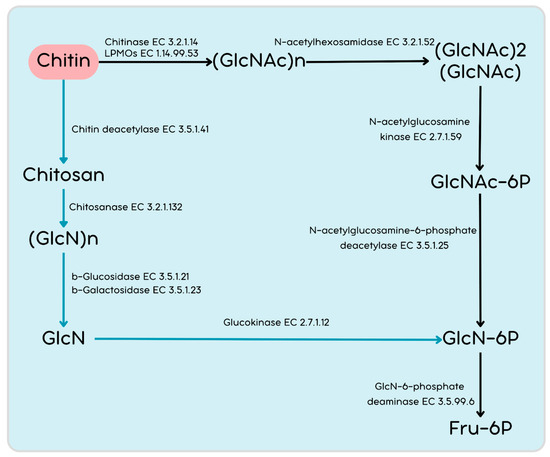 The PMB5 genome encodes N-acetylhexosaminidases classified into the GH20 (AAEO51_12015, AAEO51_20200, AAEO51_20855) and GH3 (AAEO51_06825, AAEO51_21020) families, which play important role hydrolyzing chitobiose to GlcNAc (Figure 6). Furthermore, GlcNAc may undergo phosphorylation to GlcNAc-6P by N-acetylglucosamine kinase (the PMB5 genome encodes five genes). GlcNAc-6P can be deacetylated to GlcN-6P by the N-acetylglucosamine-6-phosphate deacetylase on the downstream pathway. Moreover, GlcN-6P can be deaminated to fructose-6P by GlcN-6-phosphate deaminase. An alternative putative pathway for chitin utilization involves chitosan, employing enzymes, such as polysaccharide deacetylasesas, from the CE4 family (putative chitin deacetylases) and chitosanases (GH46 or GH75), which are also present in the PMB5 genome.