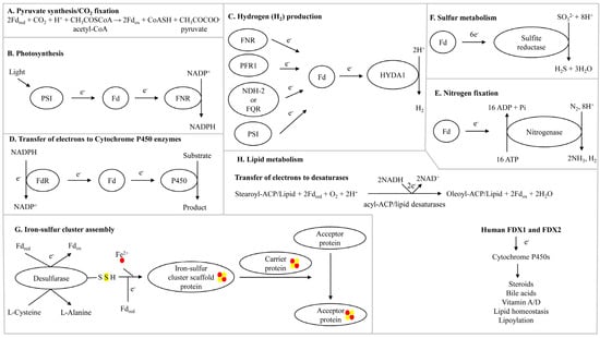 Ferredoxins play essential roles in lipid metabolism [6]. For example, ferredoxins transfer electrons to acyl-ACP and acyl-lipid desaturases, leading to the generation of unsaturated fatty acids in plants and cyanobacteria [28,29] (Figure 1H).