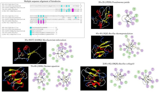 Ferredoxin interactions with different iron-sulfur (Fe-S) clusters. Each ferredoxin type is presented with its type name, Protein Databank (PDB) identification number in parenthesis, and species name. The ferredoxin crystal structures include 2Fe-2s (1PDX) from Pseudomonas putida [32], 3Fe-4S (8AMQ–ferredoxin only) from Mycobacterium tuberculosis H37Rv [33], 4Fe-4S (1IQZ) from Bacillus thermoproteolyticus [34], 7Fe-8S (1H98) from Thermus aquaticus [35], and 2[4Fe-4S] (1BQX) from Bacillus schlegelii [36]. In multiple sequence alignment, the characteristics of residues interacting with iron atoms, especially cysteine residues, are highlighted along with the characteristic proline residue. Amino acid residues are highlighted with two colors to distinguish interactions with two Fe-S clusters. The individual ferredoxins are shown with their crystal structure and Fe-S cluster(s) interactions. The covalent interactions between the Fe atom and cysteine residues are shown with a solid line. In the crystal structure, Fe and S are colored red and yellow.