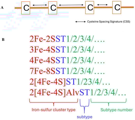 Ferredoxins subtype classification criteria (A) and nomenclature (B). (A). The spacing pattern between the cysteine amino acids of the ferredoxin Fe-S cluster binding motif within the same cluster type is considered a cysteine spacing signature (CSS) and assigned to a particular subtype (Table 1). Ferredoxins with the same CSS are grouped under the same subtype. (B). To identify ferredoxins belonging to the same subtype, a nomenclature system was developed whereby each ferredoxin was represented by its type, followed by the abbreviation ST, indicating its subtype, and a number showing it belongs to that subtype number, such that ferredoxins that belong to a subtype have the same CSS.