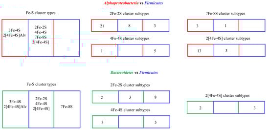 Comparative analysis of ferredoxins in Alphaproteobacteria, Firmicutes, and Bacteroidetes. Each number indicates subtype quantity in a particular Fe-S cluster type, as reported in the literature [1,48].