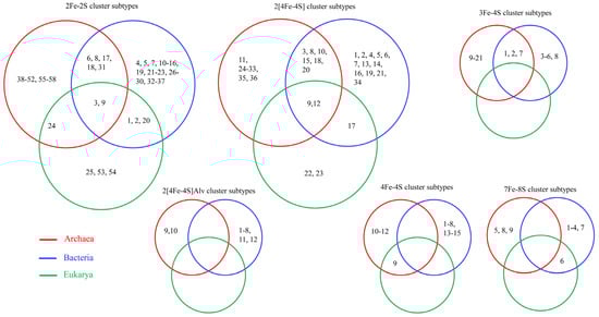 The subtype classification of ferredoxins enabled us to understand the diversity and enrichment (presence of a particular subtype of ferredoxin in organisms belonging to a specific group) of specific subtypes of ferredoxins and the evolutionary linkage of passing the same ferredoxins between species [1,48]. Analysis of ferredoxins in Alphaproteobacteria and Firmicutes revealed they share four Fe-S cluster-type ferredoxins, and two Fe-S cluster-type ferredoxins that are unique to Alphaproteobacteria [1] (Figure 4). Ferredoxin-subtype analysis revealed that these two groups of organisms have diverse subtypes within a particular Fe-S cluster type, and within the subtypes, a few subtypes are preferred/enriched, as these are present in many species [1]. The subtyping of ferredoxins also revealed that some ferredoxins have passed from Alphaproteobacteria to Firmicutes. Analysis of subtypes within a particular Fe-S cluster-type ferredoxin revealed that eight 2Fe-2S subtypes, three 2[4Fe-4S] subtypes, and a single 7Fe-8S subtype were shared between these two groups of organisms, indicating the common ancestral origin of these subtype of ferredoxins [1] (Figure 4).