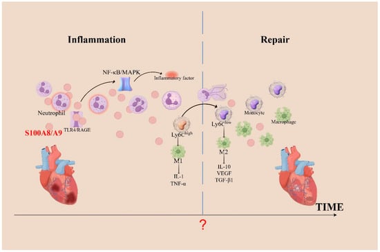 Neutrophils are the primary source of S100A8/A9 in MI, and they play a progressively significant role in the MI process. S100A8/A9 is continuously involved in the regulation of both the inflammatory and reparative phases of MI, primarily influencing the migration and differentiation of immune cells. In the early progression of MI, its expression increases and then decreases, and its expression levels vary with the number of neutrophils [65].