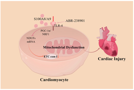 The mitochondria play major roles in cardiomyocyte death and in cardioprotective signaling. Abnormal mitochondrial structure and function can lead to a variety of CVDs, such as ischemic cardiomyopathy and heart failure. Some scholars have proposed that S100A8/A9 is a major regulator of mitochondrial function, acting by inhibiting mitochondrial function early in myocardial ischemia/reperfusion (I/R) injury, causing cardiomyocyte death. Li et al. [47] demonstrated that S100A8/A9 downregulated NDUF gene expression, leading to mitochondrial complex I inhibition through TLR4-mediated signaling. This process involves the suppression of Pparg coactivating factor 1 alpha (PGC-1α)/nuclear respiratory factor 1 (NRF1), ultimately leading to mitochondrial dysfunction. These impairments were found to be attenuated in mice lacking S100A8/A9 and were further exacerbated in transgenic mice overexpressing S100A8/A9. Another experiment showed that S100A9 knockout in mice prevented sepsis-induced cardiac injury and cardiomyocyte apoptosis while reducing superoxide production and pro-inflammatory cytokine expression, as well as significantly alleviating sepsis-induced excessive mitochondrial fission and mitochondrial respiratory dysfunction [48]. The pharmacological blockade of S100A8/A9 using the small-molecule inhibitor ABR-238901 attenuated myocardial injury in patients with endotoxemia, effectively suppressing inflammation and improving myocardial mitochondrial function [49] (Figure 2).