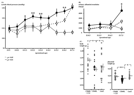 Phenotypes of CD40L and CD40L + C21 mice. (A) Systolic blood pressure in CD40L mice (closed circle: n = 9) was increased from E12.5 onward compared to that in CD40L + C21 mice (open circle: n = 9) and LacZ mice (open square: n = 9). (* p < 0.05, ** p < 0.01 vs. CD40L + C21) (B) Albuminuria in CD40L mice (closed circles: n = 10) significantly increased at E17.5 compared to LacZ mice (open squares: n = 5, p < 0.05). C21 decreased CD40L-induced albuminuria (n = 10); however, it was not statistically significant. (C) Litter weight in CD40L + C21 mice (open circle) was significantly higher than that of CD40L mice (closed circle) at E17.5. Placental weight in CD40L + C21 mice (open circle) was also significantly higher than that of CD40L mice (closed circle). Data are expressed as means ± SE (* p < 0.05, ** p < 0.01).