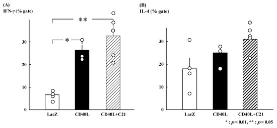 The gated percentages of IFN-γ-positive Th cells were similar in CD40L + C21 (n = 5) and CD40L (n = 3) CD40L mice (32.7% ± 4.7% and 26.4% ± 2.3%, respectively; Figure 2A). The gated percentages of IL-4-positive Th cells were also similar (CD40L + C21 [n = 5] and CD40L [n = 3] mice, 30.9% ± 2.4% and 24.9% ± 3.3%, respectively; Figure 2B).