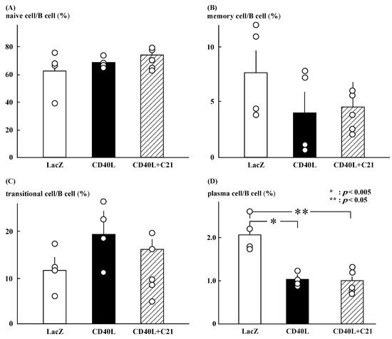 Profile of B cell subsets. (A–C) C21 (n = 5) did not significantly change the ratios of naïve, memory, and transitional B cells in CD40L mice (n = 4). (D) The ratio of plasma cells was significantly lower in CD40L mice than in LacZ mice (n = 4) (* p < 0.005, ** p < 0.05) and was not changed by C21.