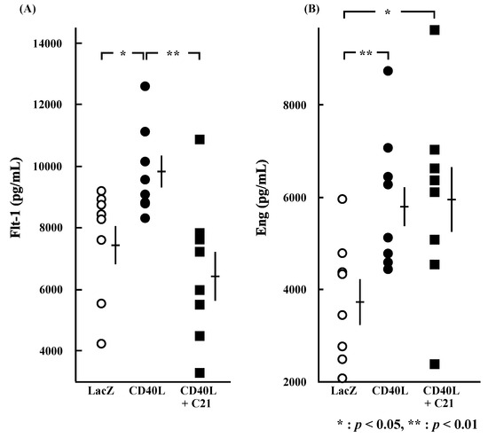 Plasma concentrations of sFlt-1 were significantly higher in CD40L mice than in LacZ mice (9704.4 ± 508.5 vs. 7497.1 ± 634.8 pg/mL, p < 0.05 [n = 8 each]; Figure 4A) and were significantly reduced by C21 (6475.9 ± 829.2 pg/mL, p < 0.01 [n = 8]). Plasma concentrations of sEng were also significantly higher in CD40L mice than in LacZ mice (5909.1 ± 525.5 vs. 3768.0 ± 465.9 pg/mL, p < 0.01 [n = 8 each]); however, they were not changed by C21 (5948.7 ± 740.8 pg/mL [n = 8]; Figure 4B).