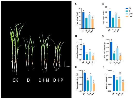 Exogenous melatonin promotes the growth of sorghum seedlings under drought stress conditions: (A) plant height; (B) root length; (C) shoot fresh weight; (D) root fresh weight; (E) shoot dry weight; (F) root dry weight. CK: control treatment; D: 20% PEG; D + M: 20% PEG + 100 μmol/L of MT; D + P: 20% PEG + 100 μmol/L of CPA; columns represent mean ± SD, and, according to the LSD test, n = 3, significant differences are indicated in lower case letters (p ≤ 0.05).