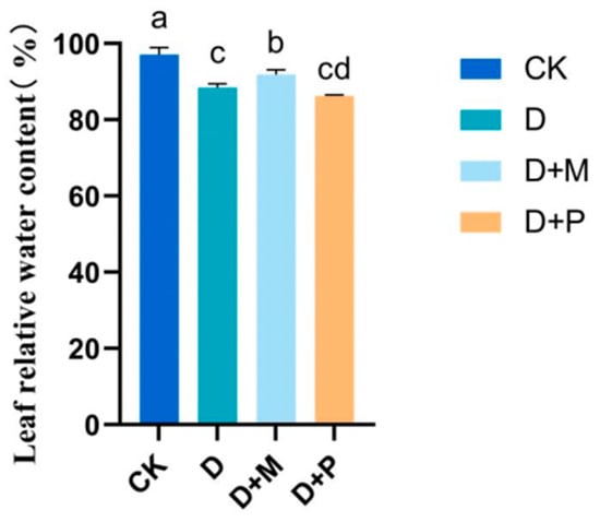 Effects of exogenous melatonin on relative water content of sorghum seedlings under drought stress. CK: control treatment; D: 20% PEG; D + M: 20% PEG + 100 μmol/L of MT; D + P: 20% PEG + 100 μmol/L of CPA; columns represent mean ± SD, and, according to the LSD test, n = 3, significant differences are indicated in lower case letters (p ≤ 0.05).