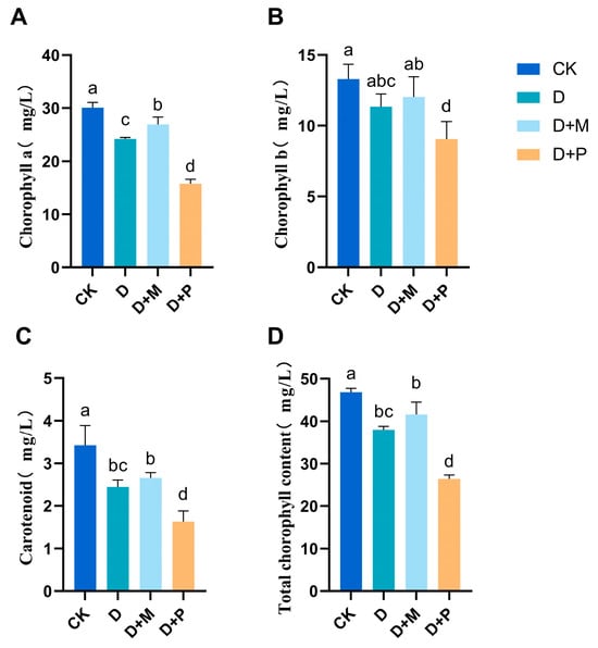 Effect of melatonin spraying on chlorophyll content in sorghum seedlings under drought stress: (A) chlorophyll A; (B) chlorophyll b; (C) carotene; (D) total chlorophyll. CK: control treatment; D: 20% PEG; D + M: 20% PEG + 100 μmol/L of MT; D + P: 20% PEG + 100 μmol/L of CPA; columns represent mean ± SD, and, according to the LSD test, n = 3, significant differences are indicated in lower case letters (p ≤ 0.05).