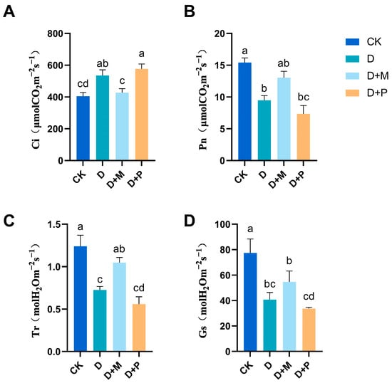 Under drought conditions, exogenous melatonin promotes the gas exchange of sorghum leaves: (A) Ci; (B) Pn; (C) Tr; (D) Gs. CK: control treatment; D: 20% PEG; D + M: 20% PEG + 100 μmol/L of MT; D + P: 20% PEG + 100 μmol/L of CPA; columns represent mean ± SD, and, according to the LSD test, n = 3, significant differences are indicated in lower case letters (p ≤ 0.05).