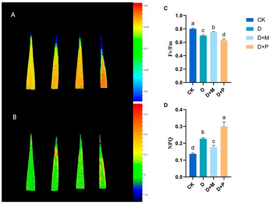 Under drought conditions, exogenous melatonin promoted the improvement of Fv/Fm and alleviated the increase in NPQ in sorghum leaves: (A,C) Fv/Fm; (B,D) NPQ. CK: control treatment; D: 20% PEG; D + M: 20% PEG + 100 μmol/L of MT; D + P: 20% PEG + 100 μmol/L of CPA; columns represent mean ± SD, and, according to the LSD test, n = 3, significant differences are indicated in lower case letters (p ≤ 0.05).