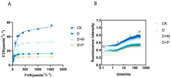 Utilizing the dual-channel fluorescence measurement system Dual-PAM-100 (WALZ, Bayern, Germany), photosynthetically active radiation (PAR) intensities were set at 19, 37, 47, 104, 184, 246, 416, 650, 1009, and 1548 μmol m−2 s−1. For each treatment, the electron transport rate (ETR) of the first leaf from the top of sorghum seedlings was randomly measured, with four repetitions, and the PAR-ETR response curves were plotted. The rapid light response curve parameters of ETR were fitted using the Platt rapid light response model, with the formula as follows: