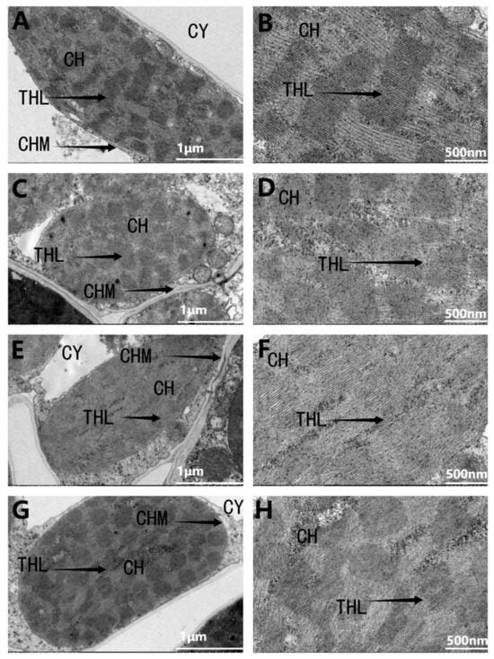 Using the first fully unfolded leaf from the top, the ultrastructure of chloroplasts was measured. Prior to sampling, the leaves were meticulously cleaned with distilled water, and any surface moisture of the leaves was removed using filter paper. Subsequently, small strips (1 mm × 3 mm) were excised avoiding the veins and preserved in a solution of 2.5% pentanediol. Samples were processed according to Shu et al. []. The samples were sectioned into 50 nm ultrathin slices using a Leica EM UC7 ultrathin microtome (Wuhan Servicevio Technology Co., Ltd., Wuhan, China). These slices were stained using uranium acetate and alcohol. Finally, the stained samples were observed with a transmission electron microscope.