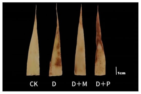 Effects of melatonin spraying on DAB staining of sorghum seedling leaves under drought stress. CK: control treatment; D: 20% PEG; D + M: drought + 100 μmol/L of MT; D + P: drought + 100 μmol/L of CPA.