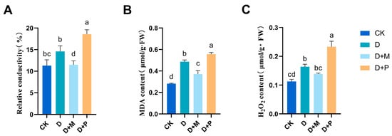 Effect of melatonin spraying on relative conductivity, MDA content, and hydrogen peroxide content in sorghum seedlings under drought stress: (A) relative conductivity; (B) MDA content (C) hydrogen peroxide content. CK: control treatment; D: 20% PEG; D + M: 20% PEG + 100 μmol/L of MT; D + P: 20% PEG + 100 μmol/L of CPA; columns represent mean ± SD, and, according to the LSD test, n = 3, significant differences are indicated in lower case letters (p ≤ 0.05).