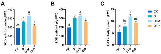 Under drought conditions, exogenous melatonin promoted the increased activity of SOD, POD and CAT in sorghum leaves: (A) SOD activity; (B) POD activity; (C) CAT activity. CK: control treatment; D: 20% PEG; D + M: 20% PEG + 100 μmol/L of MT; D + P: 20% PEG + 100 μmol/L of CPA; columns represent mean ± SD, and, according to the LSD test, n = 3, significant differences are indicated in lower case letters (p ≤ 0.05).
