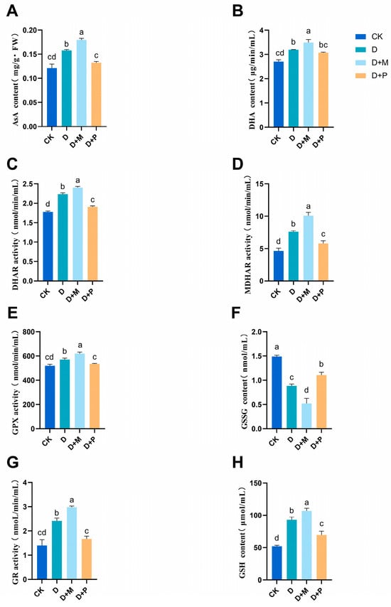 Under drought stress, melatonin affects the antioxidant content in sorghum chloroplast: (A) AsA content; (B) DHA content; (C): DHAR content; (D): MDHAR content; (E): GSH content; (F): GSSG content; (G) GPX content; (H) GR content.CK: control treatment; D: 20% PEG; D + M: 20% PEG + 100 μmol/L of MT; D + P: 20% PEG + 100 μmol/L of CPA; columns represent mean ± SD, and, according to the LSD test, n = 3, significant differences are indicated in lower case letters (p ≤ 0.05).