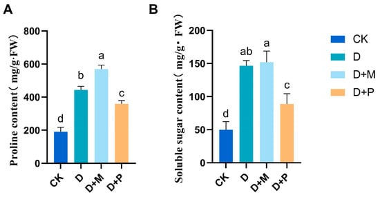 Under drought conditions, exogenous melatonin promoted the increase in proline and soluble sugar content in sorghum leaves: (A) free proline content; (B) soluble sugar content. CK: control treatment; D: 20% PEG; D + M: 20% PEG + 100 μmol/L of MT; D + P: 20% PEG + 100 μmol/L of CPA; columns represent mean ± SD, and, according to the LSD test, n = 3, significant differences are indicated in lower case letters (p ≤ 0.05).