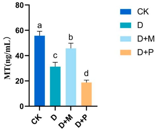 Under drought conditions, exogenous melatonin promoted the increase in melatonin content in sorghum leaves. CK: control treatment; D: 20% PEG; D + M: 20% PEG + 100 μmol/L of MT; D + P: 20% PEG + 100 μmol/L of CPA; columns represent mean ± SD, and, according to the LSD test, n = 3, significant differences are indicated in lower case letters (p ≤ 0.05).