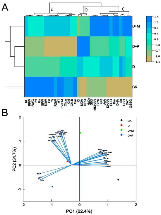 (A) The cluster heatmap shows a comprehensive visual overview of the responses of different parameters to different treatments, using the normalized mean values to facilitate effective comparisons. (B) Principal component analysis (PCA) analyzes the complex relationship between processing and parameters. Figure (B), the two components of PC1 and PC2 together accounted for 97.10% of the variance in the data set. Positive or negative correlations between various morphological physiological and biochemical parameters and various treatments are illustrated by the vector lines of the biplot. Small angles indicate a weak association, while large angles indicate a strong association. The parameters include PH (plant height), RL (root length), SFW (shoot fresh weight), RFW (root fresh weight), SDW (shoot dry weight), RDW (root dry weight), RWC (leaf relative water content), Pn (photosynthetic rate), Tr (transpiration rate), Ci (intercellular carbon dioxide concentration), Gs (stomatal conductance), Chl (total chlorophyll), Chl. a (chlorophyll a), Chl.b (chlorophyll b), Car (carotenoids), Fv/Fm, NPQ, RC (relative conductivity), SOD, POD, CAT, MDA, GR, GSSG, GSH, GPX, AsA, DHA, DHAR, MDHAR, MT (melatonin), Pro (proline), and Ss (soluble sugars).