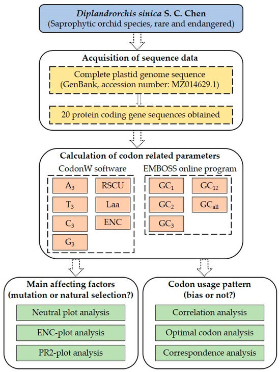 Flowchart for data acquisition and analysis of codon usage bias in the plastid genome of Diplandrorchis sinica.