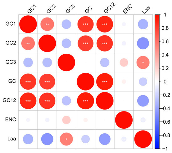 Correlation analysis between the indexes of codon usage in the plastid genome of Diplandrorchis sinica. Notes: “*” indicates a significant correlation at the p < 0.05 level, “**” indicates a significant correlation at the p < 0.01 level, “***” indicates a significant correlation at the p < 0.001 level.